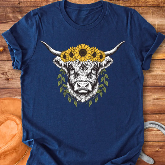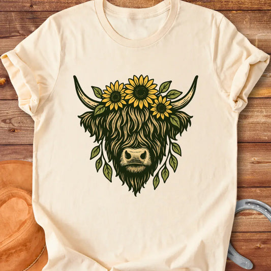 Rustic Sunflower Highland Cow Illustration T-Shirt